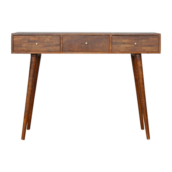 • Artisan Furniture Solid Wood 3 Drawer Assorted Chestnut Console - This beautiful console table has been constructed from 100% solid mango wood and features 3 drawers perfect for storage 2 of which have an assorted pattern on the front. Some other product features include Nordic style legs and shiny candle knobs for easy access to and from the drawers. A lovely versatile piece that will complement any room perfectly.