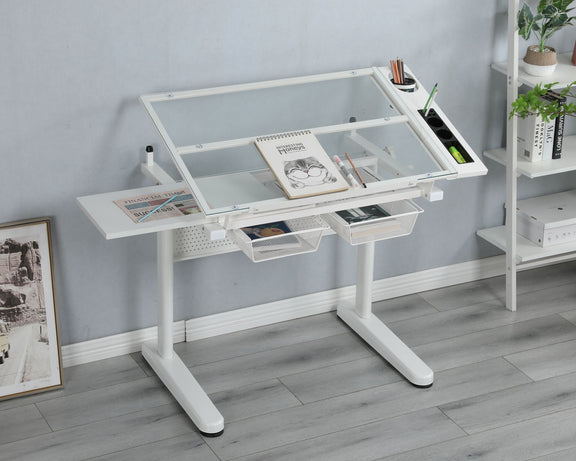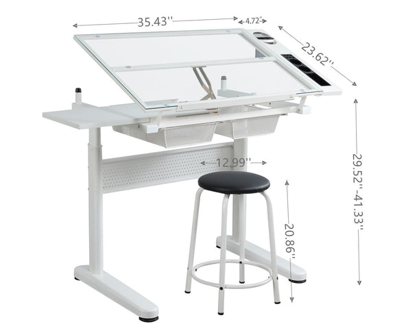38.18" Hand Crank Adjustable Drafting Table Drawing Desk With 2 Metal Drawers With Stool - White