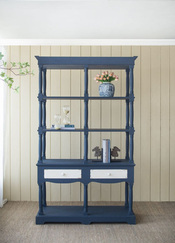 4 Tiered Wooden Shelf With Two Drawers, Farmhouse Wood Bookcase Display Storage Shelf Etageres - Antique Navy Blue