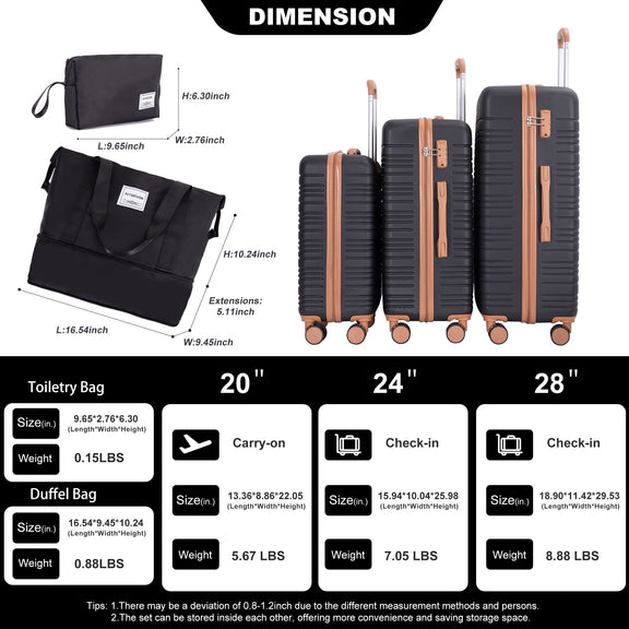 5 Piece Set (20"24"28 +A Travel Bag And A Toiletry Bag), Hard Case Spinner Wheels Luggage Sets With Tsa Lock Carry On Suitcase Luggage Durable Suitcase - Black