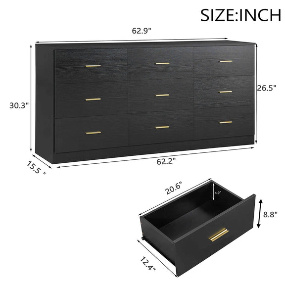 9 Drawer Dresser For Bedroom Ample Storage Wide Chest Of Drawers - Black