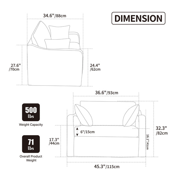 - Spacious Seating: 45.27" wide seat with dual bolsters and large back pillow for enhanced comfort and support
