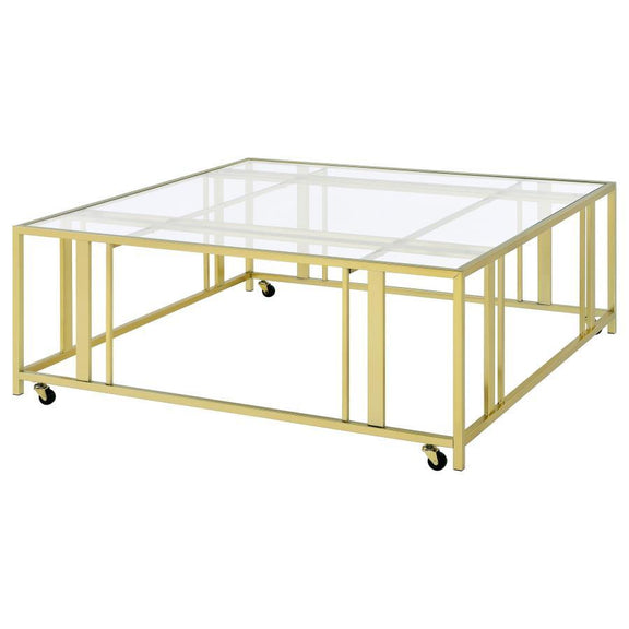 Adri - Square Glass Top Coffee Table With Casters - Matte Brass