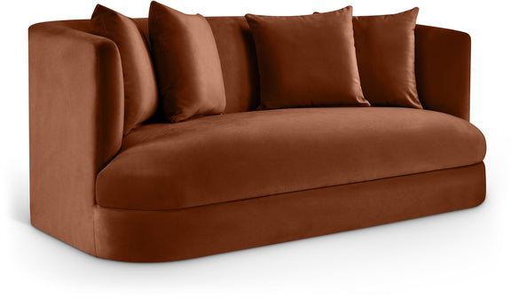 The Alder cognac velvet upholstered loveseat is an invitation to relax. Its rounded silhouette and soft velvet upholstery create a cozy and inviting space, perfect for lounging with loved ones. Whether you're hosting guests or enjoying a quiet evening, this loveseat is the perfect blend of comfort and style.