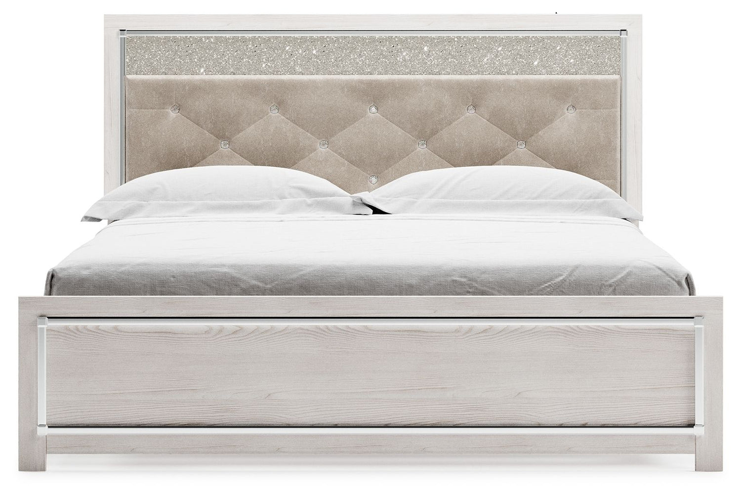 - Includes upholstered panel headboard, panel footboard, platform rails and roll slats