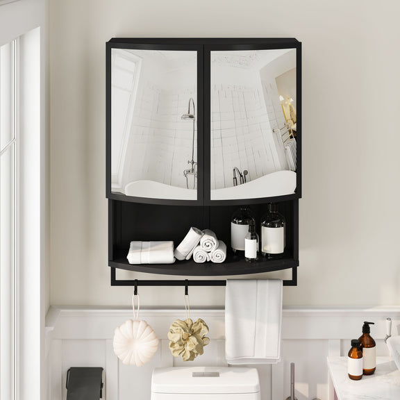 Arched Glass Double Door Wardrobe With Shatterproof Mirror, Open Shelf & Towel Rack - Black