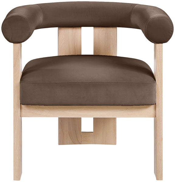 Wrapped in ultra-luxe velvet, the Arienzo upholstered chair captures the elegance of Art Deco design. Its rounded backrest and plush seat rest on sturdy natural-finished solid wood legs for a look that's both sculptural and inviting. A true statement piece, it adds warmth and sophistication to any room.