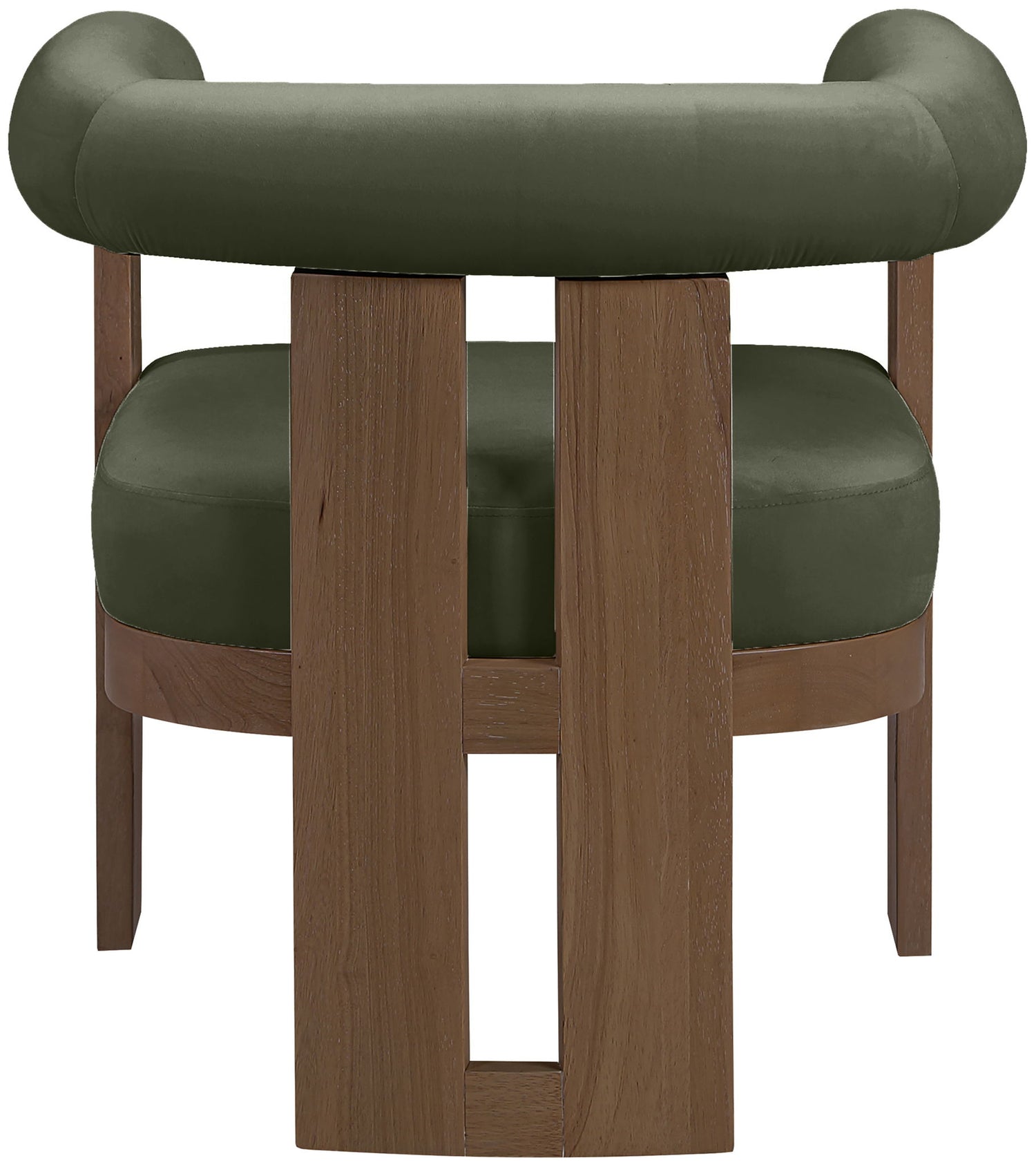 Wrapped in ultra-luxe velvet, the Arienzo upholstered chair captures the elegance of Art Deco design. Its rounded backrest and plush seat rest on sturdy brown walnut-finished solid wood legs for a look that's both sculptural and inviting. A true statement piece, it adds warmth and sophistication to any room.