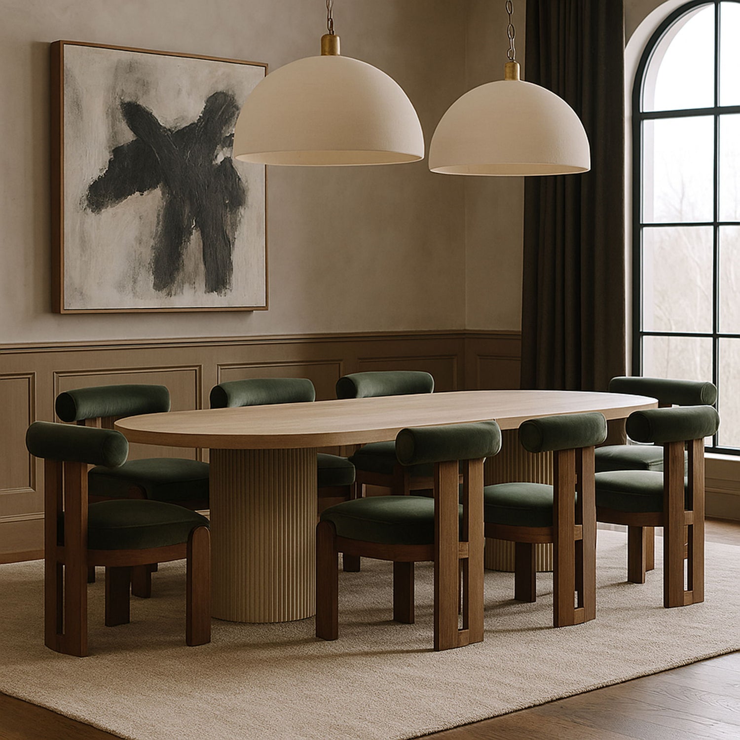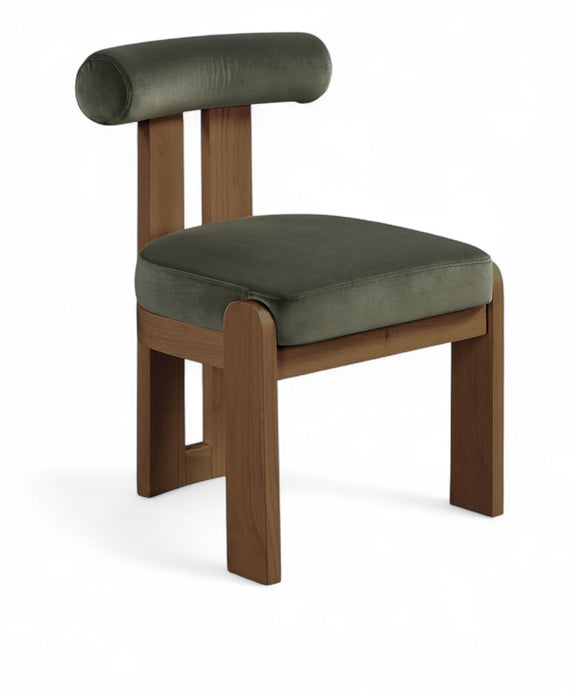 Elegant and sculptural, the Arienzo velvet upholstered dining chair adds Art Deco sophistication to any dining space. Its ultra-luxe velvet upholstery pairs beautifully with walnut-finished solid wood legs for warmth and stability. With its distinctive rounded backrest, this chair blends comfort with timeless style.