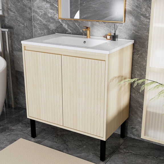 Bathroom Vanity With Ceramic Sink, Floor-Standing Design, Soft-Closing Drawers