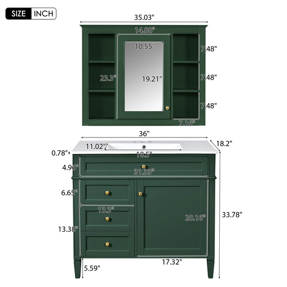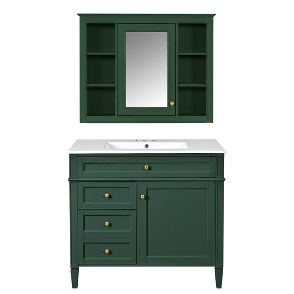 36" Bathroom Vanity With Mirror Cabinet, Sink, Cabinet, 2 Soft Closing Doors & 4 Drawers - Green