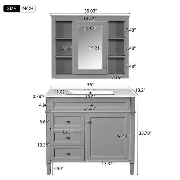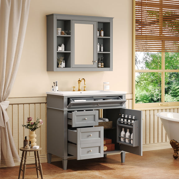 36" Bathroom Vanity With Mirror Cabinet, Storage Unit With 2 Soft Closing Doors And 4 Drawers, Drop In Sink - Gray