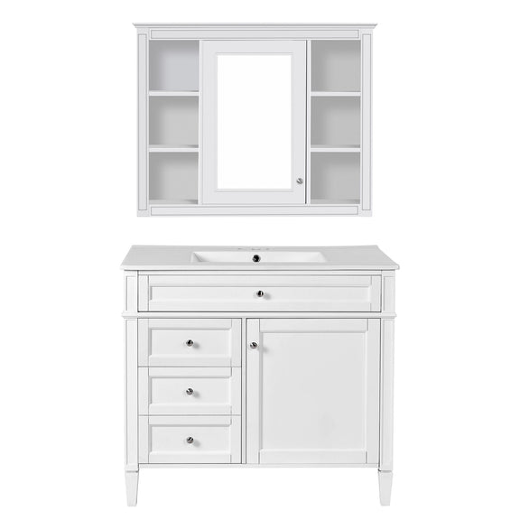 36" Bathroom Vanity With Mirror Cabinet, Sink, 2 Soft Closing Doors & 4 Drawers - White