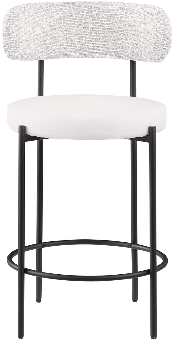 Make family, friends, and guests want to stay 'till closing time when they're seated on these Beacon vegan leather and boucle fabric bar stools/counter stools. These handsome stools are just the thing your kitchen counter or home bar is missing, with their ultra-modern design and beautiful look. The curved backs support the body while you sip a frosty cold one or nosh on some breakfast fare. A matte metal frame gives the stools' design durability while the black vegan leather seat and boucle fabric back adds a touch of softness and comfort.