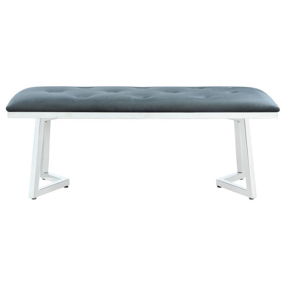 Add a sophisticated edge to your dining space with this contemporary velvet dining bench. Upholstered in plush grey velvet with button tufting, it offers a soft and inviting seat. The polished stainless steel base boasts a striking angular frame, delivering modern glam appeal. Ideal for extra seating at the dining table, this bench is both stylish and functional for upscale interiors.