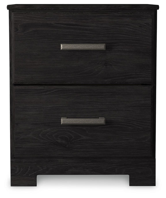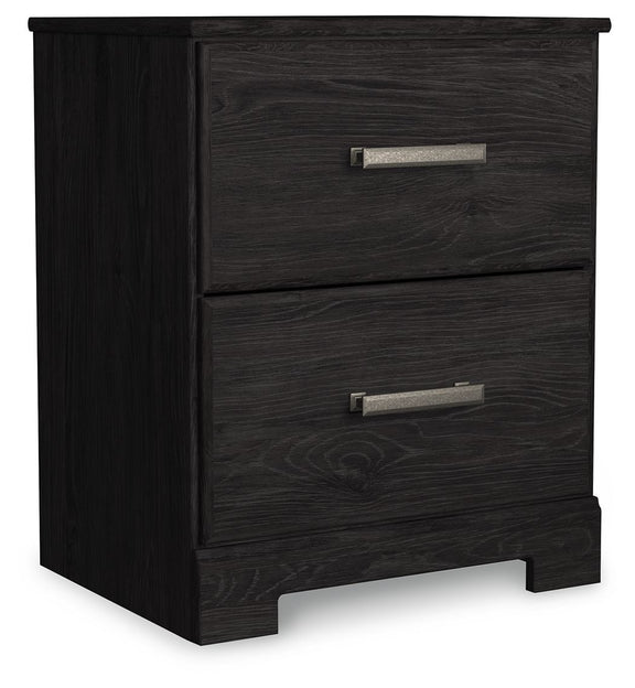 With its clean-lined look and modern attitude, this nightstand is a fresh style awakening. A warm charcoal hue over replicated oak grain easily complements other furniture finishes. Smooth drawer fronts with antiqued pewter-tone handles complete the aesthetic.