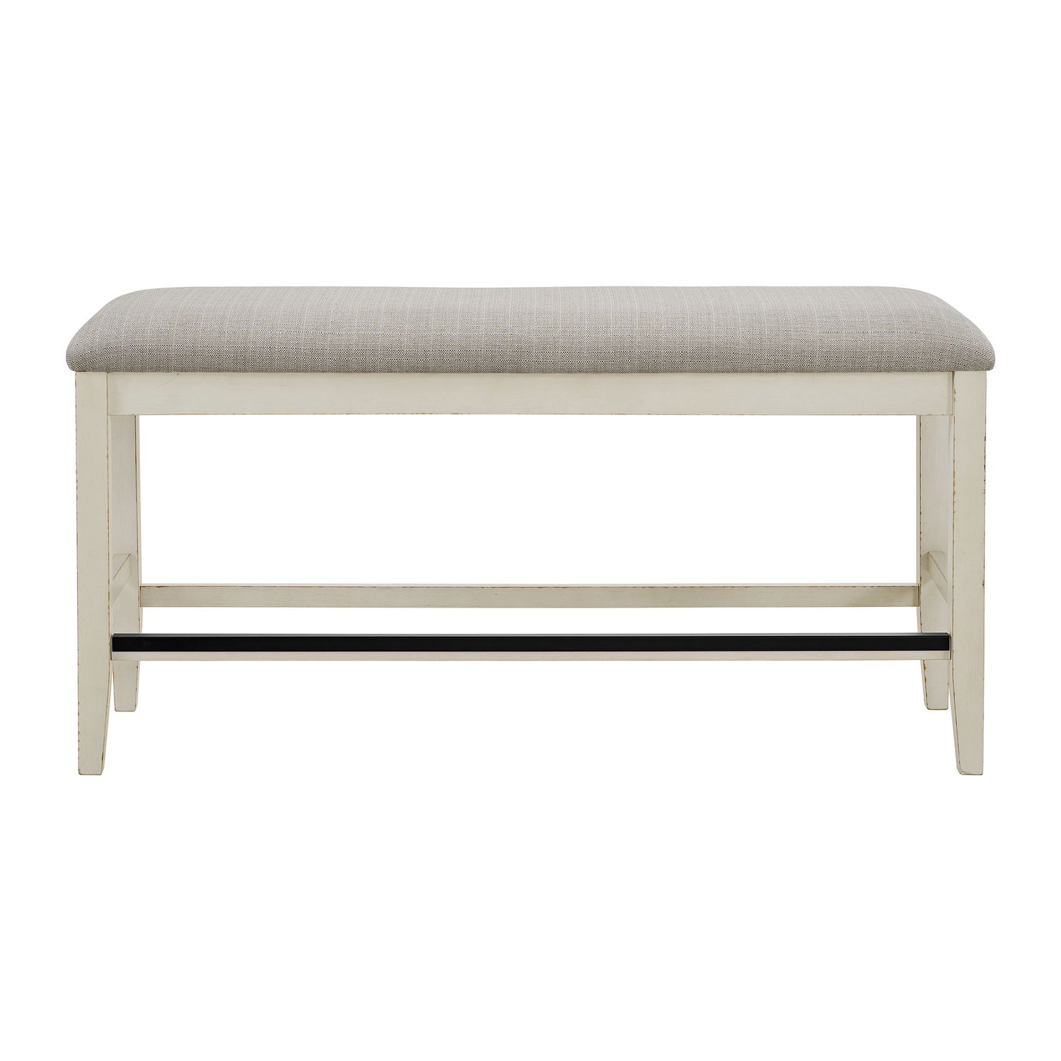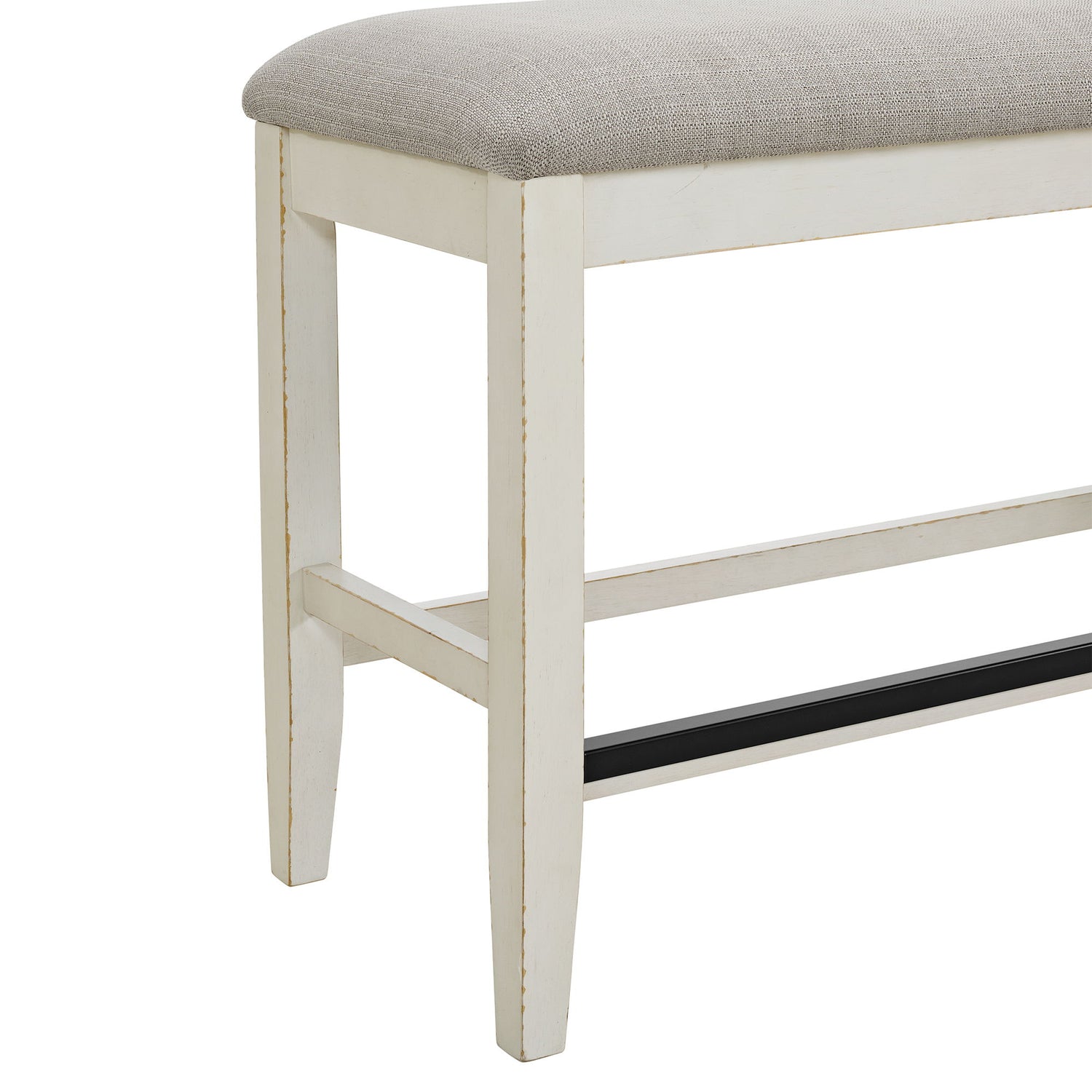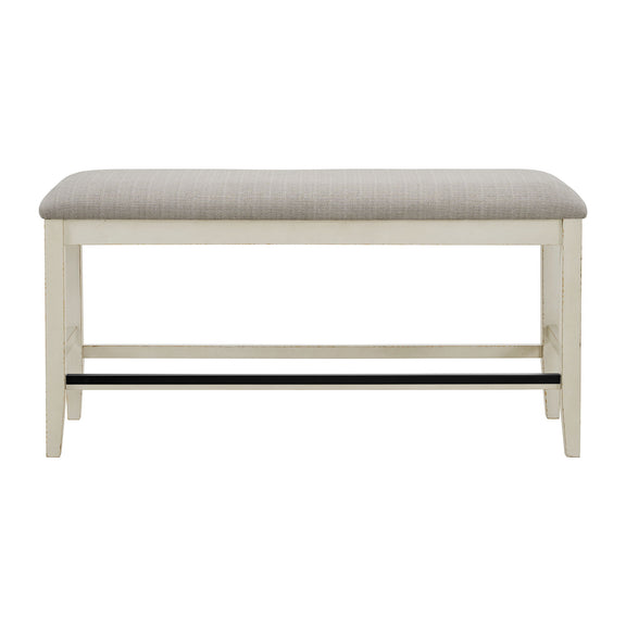 Enhance your dining experience with the Bellevue Counter Bench. It is constructed of rubberwood with distressed edges for a rustic look. The foam cushion upholstered seat provides both comfort and style to your dining area. With stretchers for added stability, this counter bench is not only beautiful but also durable. Bring a touch of farmhouse charm to your home dining experience with a Bellevue collection piece today!