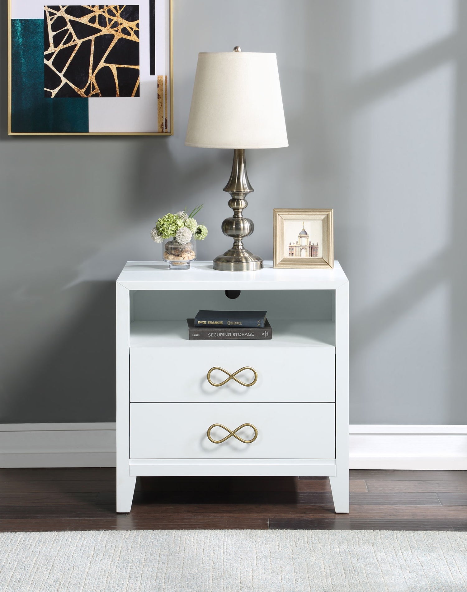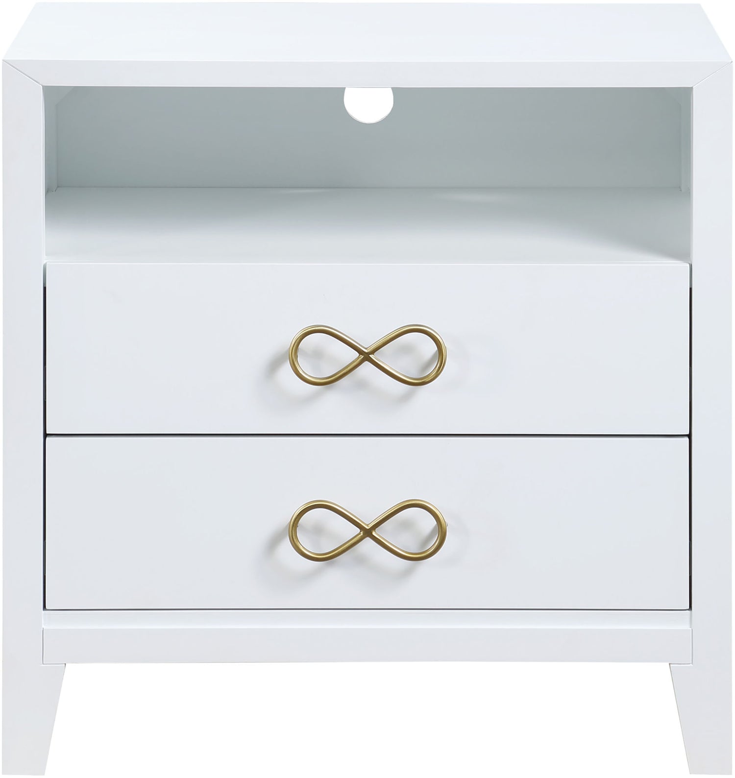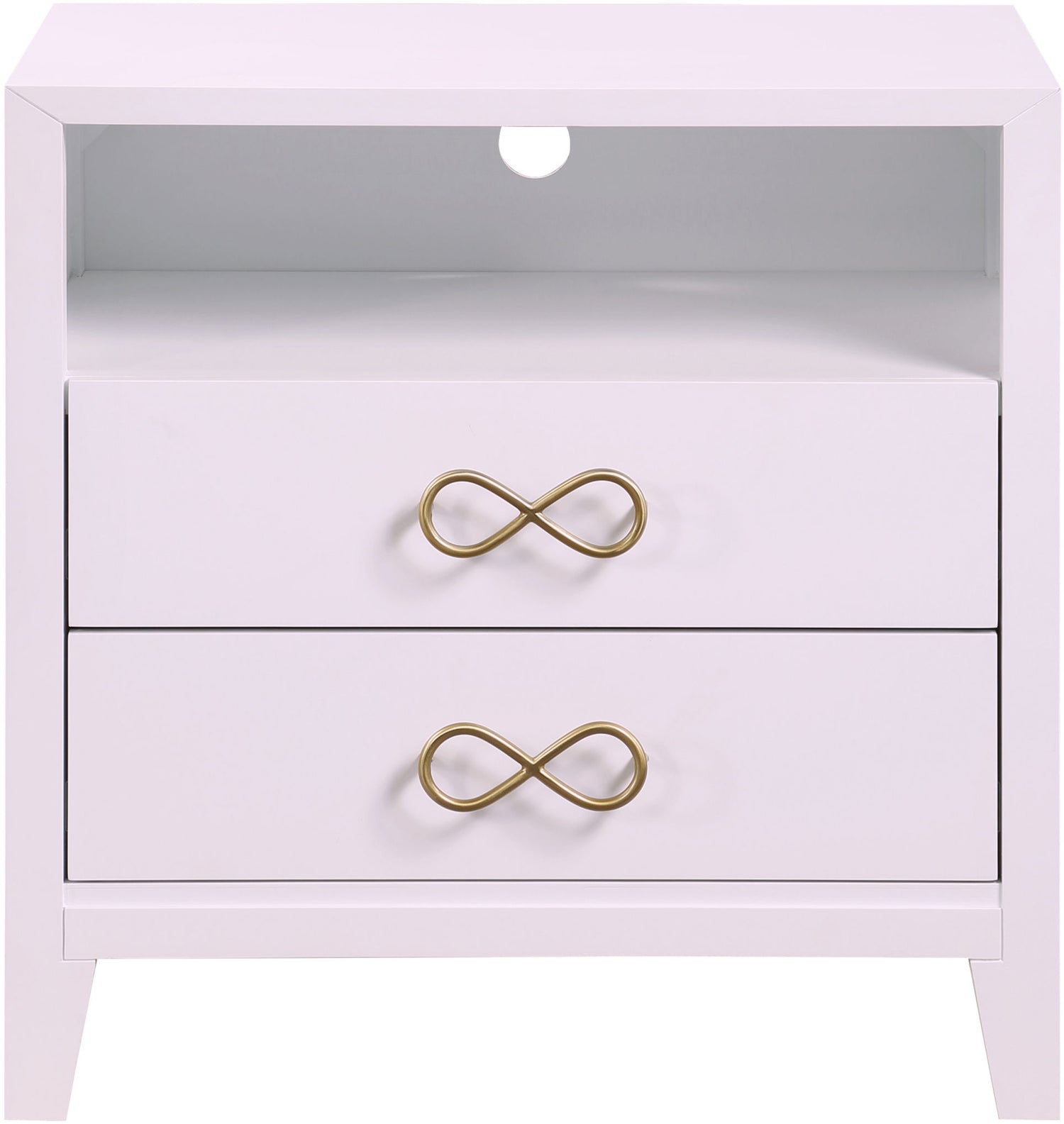 Bring unique elegance to your bedroom with this Bowtie night stand from Meridian Furniture. This night stand features two drawers and a shelf, providing you with plenty of storage space for clothes, linens, or miscellaneous objects. Its light pink color adds a touch of femininity to your living space, and its brushed bow tie handles complement your existing decor. Its flat top is perfect for placing a lamp, framed picture, books, bric-a-brac, and more.