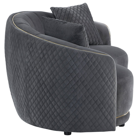 The Brookside Dark Grey Loveseat is a loveseat constructed from upholstered material with a plush texture that offers comfortable seating for your living space. A fully encased solid and engineered wood frame provides lasting durability. Gold trim outlines its modern curved silhouette, adding a distinct design element.