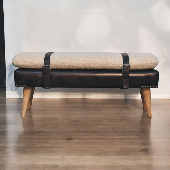 - Boucle Buffalo Hide Leather Bench - Derived from the French word for curled or ringed yarn or fabric. This handwoven upholstered furniture piece is made of 100% cotton and natural yarn, featuring buffalo hide leather to create a beautiful fusion of colours and materials. It has a belted strap design and also features solid wood legs which have and finish providing strength and durability.