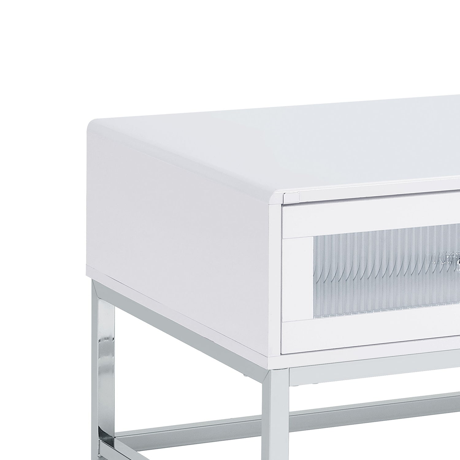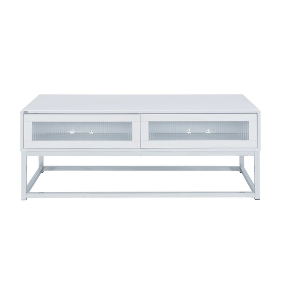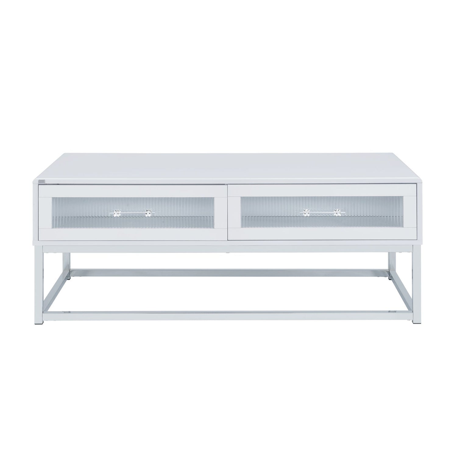 Add a touch of modern elegance to your living room with the Chandra Coffee Table. This stunning table features a glossy white finish and a sleek chrome-finished metal base, creating a contemporary look that will elevate any space. The LED lights add a pop of color and ambiance, while the spacious drawers provide ample storage for your essentials. The acrylic handles add a touch of sophistication and style to the overall design. Bring stylish functionality to your home with the Chandra Coffee Table.