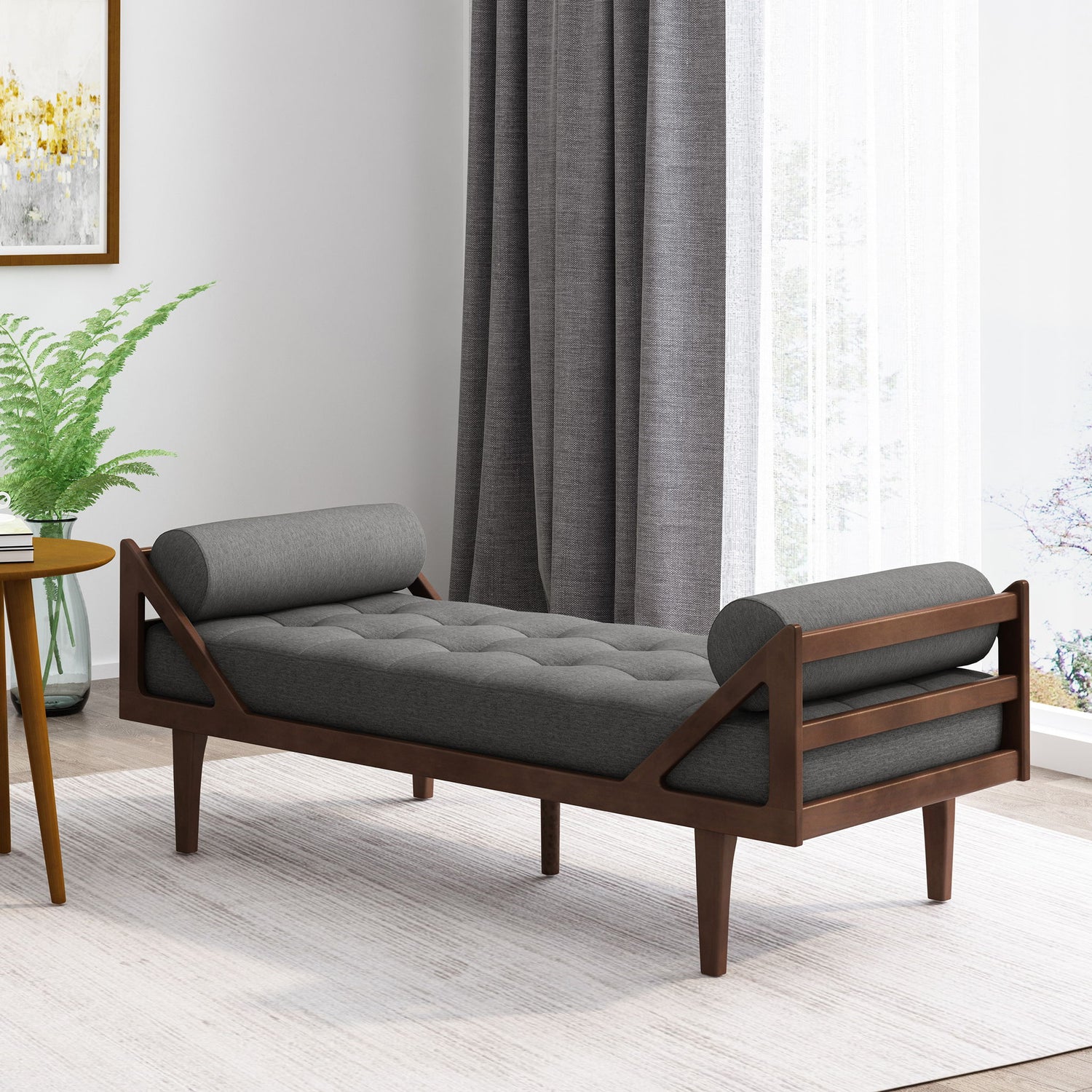 Contemporary Fabric Chaise Lounge With Button Tufted Waffle Stitching And Rolled Accent Pillows - Charcoal