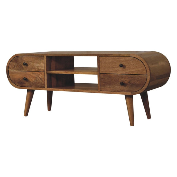 - Features: media unit, solid mango wood, handcrafted, 4 drawers, 2 shelves, living room furniture, curved, rounded edges