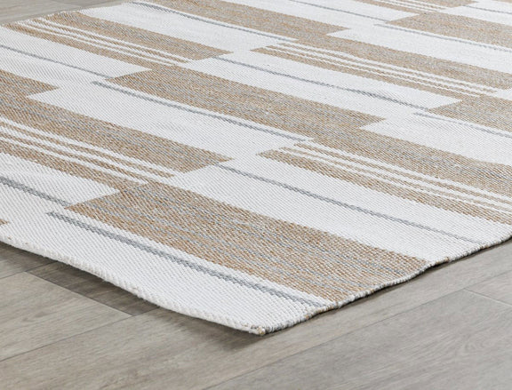 Handwoven with soft, weather-resistant materials, this handsome California inspired rug pulls any space together with its casual appeal. Graphic bands add subtle color to complement any color palette while effortlessly enhancing any decor.