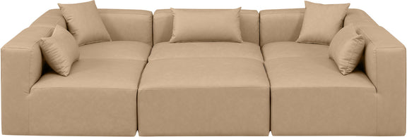 Elevate your space with the luxurious Cube Vegan Leather Modular Sectional. This modular sectional exudes modern elegance, charm, and comfort making it a perfect addition to any contemporary living space. Its clean lines and cube shape are reminiscent of minimalist design, while the plush tan vegan leather upholstery adds a touch of luxury and sophistication. The chair's versatile construction and geometric aesthetic seamlessly integrate into various design styles, from sleek living rooms to chic home offices, embodying the essence of modern design and creating a sense of order and tranquility in your space.
