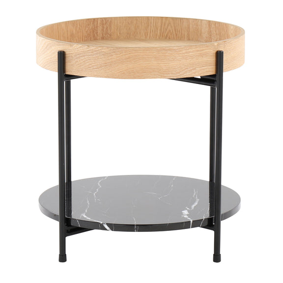 - Modern Design: The Daniella End Table by LumiSource combines a round natural wood top with a sleek black metal frame and a faux marble shelf, providing a stylish mixed material modern look that enhances any room's decor.