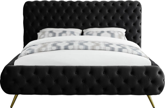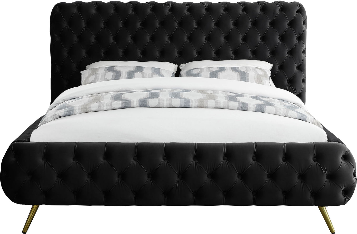 Surround yourself in modern luxury when you add this Delano Bed to your bedroom oasis. Sumptuous by design, this bed features all-over button tufting for a look that is nothing short of stunning. This dimensional bed features a heavily padded headboard and side rails, each covered in magnificent-to-the-touch velvet for a look that's upscale and simply divine. Metal legs on this bed allow easy clearance for vacuuming, and the bed uses just a mattress, so there's no need for a box spring or foundation, which only adds to its sleek look.