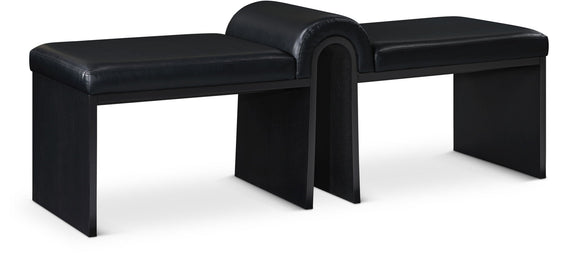 Seamlessly blending modern elegance with timeless craftsmanship, the Delphine vegan leather upholstered bench has a unique curvature to uplift any space. Upholstered in soft vegan leather, this bench offers a sleek, refined look complemented by its black finish and oak veneer base. Crafted from a mix of solid wood and MDF, its contemporary design provides both durability and style, making it a versatile statement piece.