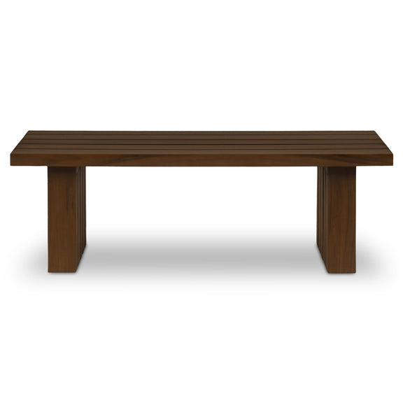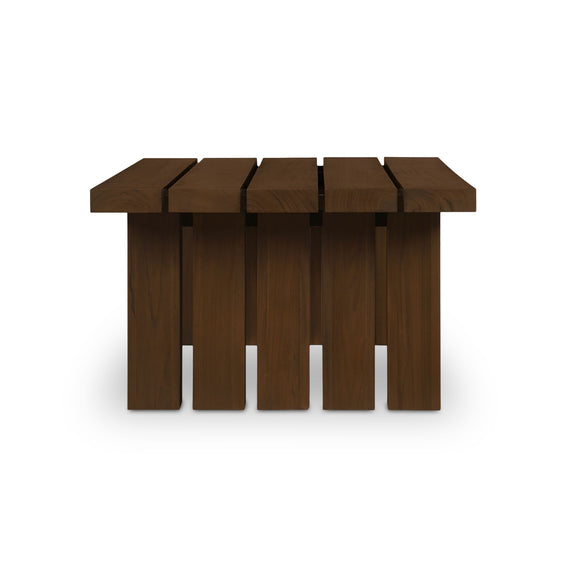 Lightweight look, laid-back feel. Denby keeps things lifted with an open frame and laid-back feel. A slatted teak top lets light and air move through, while square post legs ground the silhouette. Finished in a warm, toasted tone, it adds natural texture to any setup. Simple, solid, and built to live easy—indoors or out.
