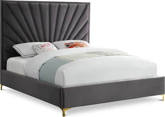 Turn up the wow factor in your bedroom with this Eclipse Bed from Meridian Furniture. Stunning velvet upholstery in a posh color brings rich elegance and style to your space. A fan-like shell pattern on the headboard is achieved with channel tufting, which keeps the padded headboard plump and full, so it supports your back while you sit up in bed, binging on your favorite shows. Metal legs finish off this bed's luxe look, giving it a modish slant.