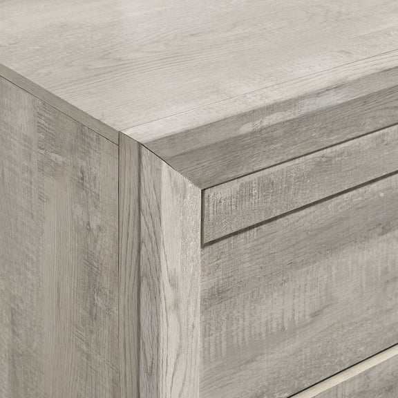 The Ellen 5-Drawer Chest in White is the perfect addition to your bedroom. Crafted of solid wood, mdf, and plywood in a ash white finish. Exposed wood grain detailing and fashioned with rustic-inspired distressing for character. Beautiful black drawer pulls for a modern approach to a rustic look. Features five drawers and dust proofing at bottom drawer for protecting your clothing from dust. The Ellen 5-Drawer Chest has a natural-looking aesthetic, perfect for any farmhouse or transitional style bedroom.