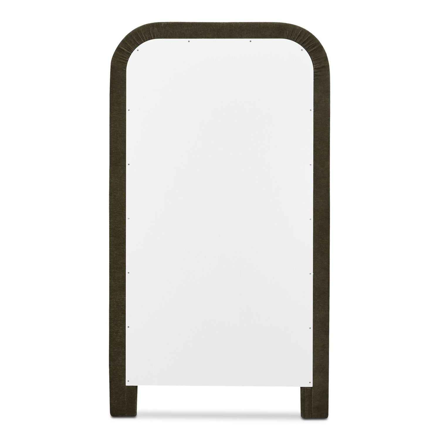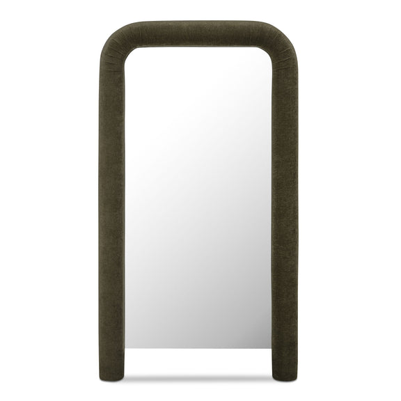 - Large floor mirror with modern, soft corners with ruched detail & soft-touch fabric upholstery