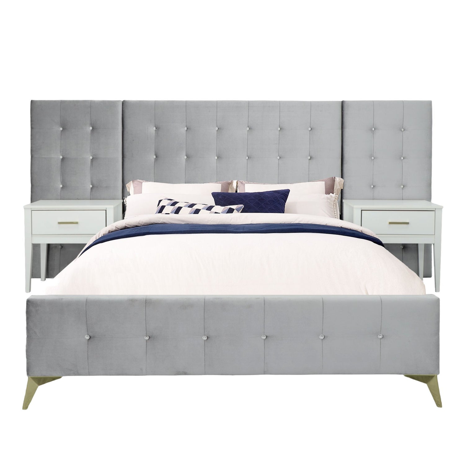 Give yourself the glamourous experience you deserve with this beautiful bedroom collection. The show-stopping set includes a beautifully upholstered grey fabric that covers the headboard, footboard, and side rail. A 12-slat hook system is anchored by golden legs that add a touch of modern beauty, while the tall, three-panel headboard adds just the right amount of drama to elevate any bedroom. Once paired with the two white-finish nightstands, you will have a luxurious environment that will have you feeling majestic each time you drift off to rest.