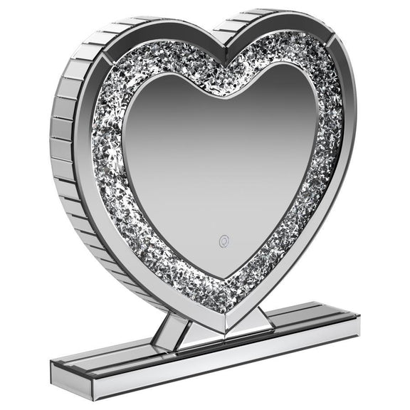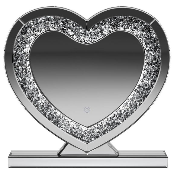 - The heart shape mirror features a silver frame and stand for displaying on a table or shelf