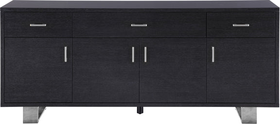 Organize flatware and silverware in the three spacious drawers of this Excel sideboard buffet. This beefy sideboard offers room aplenty for holding things you need in the dining roomout of sight and out of mind. The rich gray oak veneer lacquer finish with chrome base and handles gives this unit the modern panache needed to mesh with nearly any contemporary dining set. Wood and stainless steel construction ensures lasting beauty and long-lived performance.