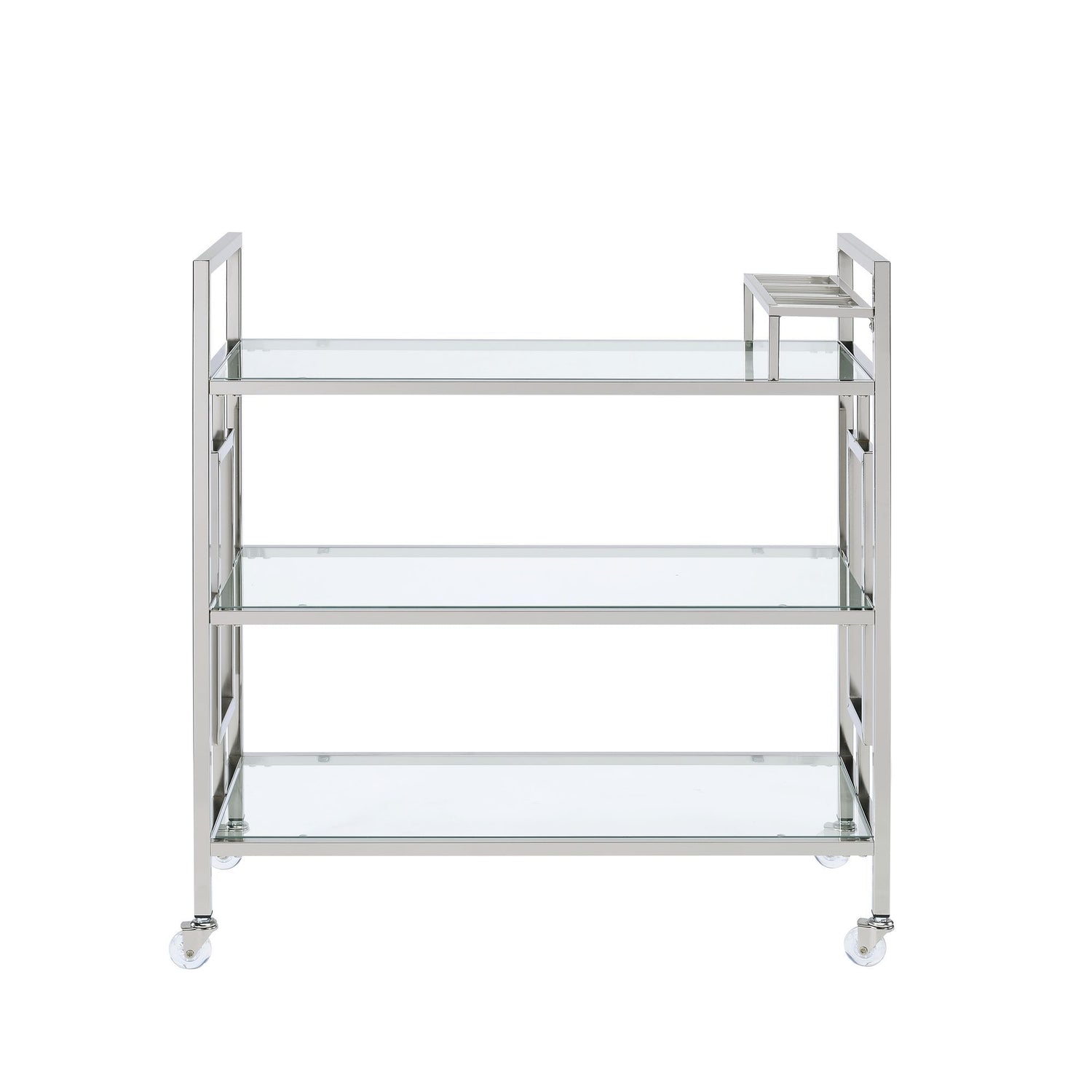 The Ezra Serving Bar Cart is modern glam at its best! This rectangular glass bar cart will give your living room or dining room the extra pizzazz it needs. This cart features three clear tempered glass shelves for your serving pleasure. If you want to impress your guests, you can travel with this cart from room to room serving beverages as this cart comes with casters. The sides of the cart display an intricate chrome design adding extra flair to this already stylish piece. Adding this piece to your home will instantly add style and glam, a look youll never get tired of.