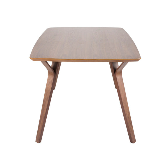 • Design & Style: The Folia Dining Table features a Mid-Century Modern design with a rectangular top, rounded edges, and splayed tapered legs, offering a clean and contemporary aesthetic.