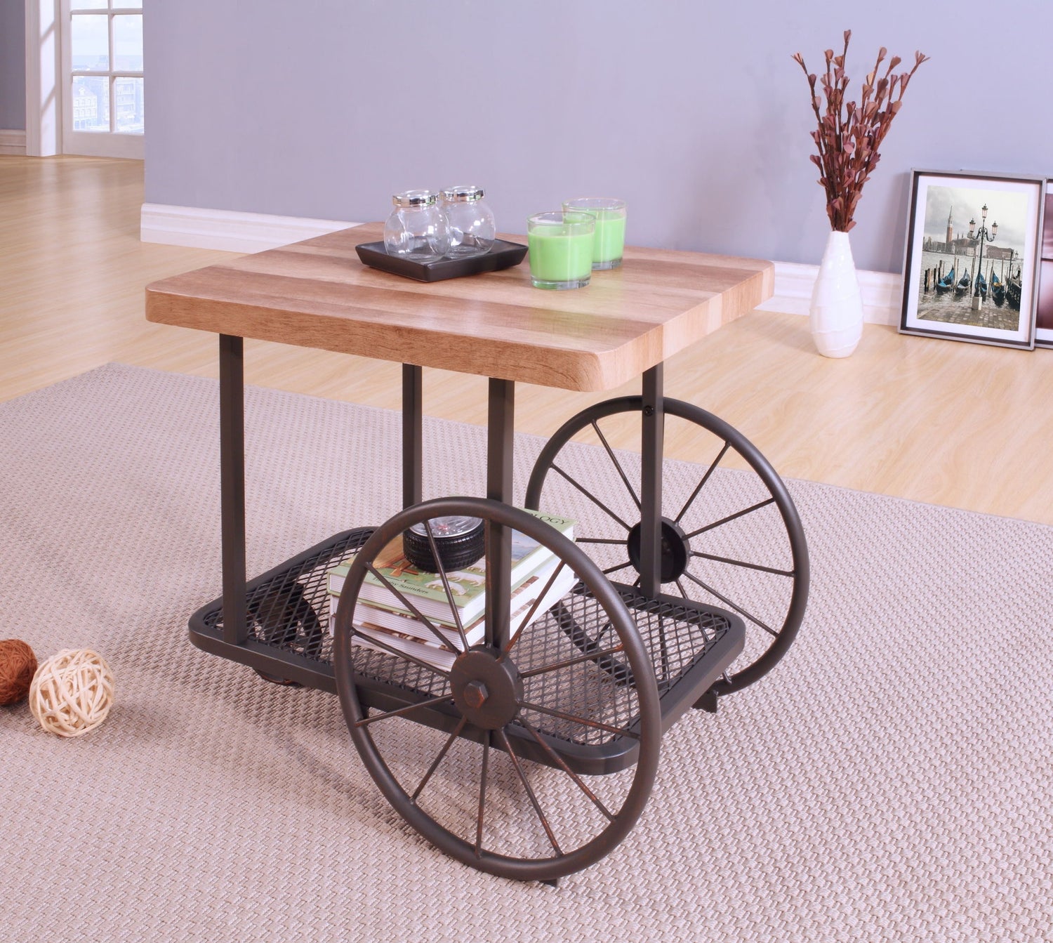 - Industrial Aesthetic: Equipped with industrial-style metal wheels in an antique sand and bronze hand-painted finish, the table adds functionality and a worn-in aesthetic.