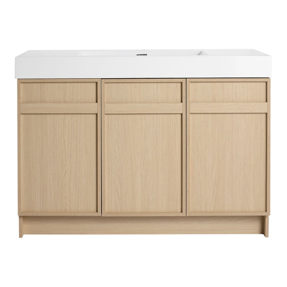 Modern Freestanding Bathroom Vanity, White Resin Sink & Soft Close Cabinet Doors - Oak