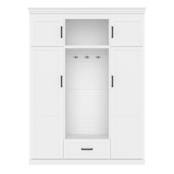 Hall Tree With Bench And 3 Hooks, Modern Entryway Storage Organizer Cabinet With 4 Doors, 1 Drawer And Adjustable Shelves For Hallway, Entryway, Living Room - White