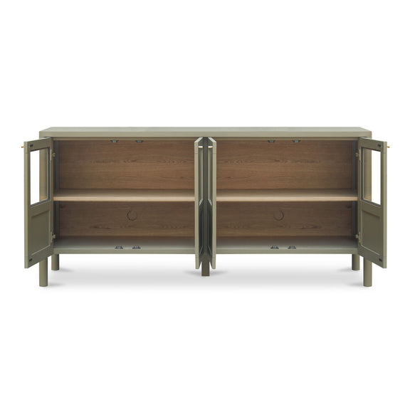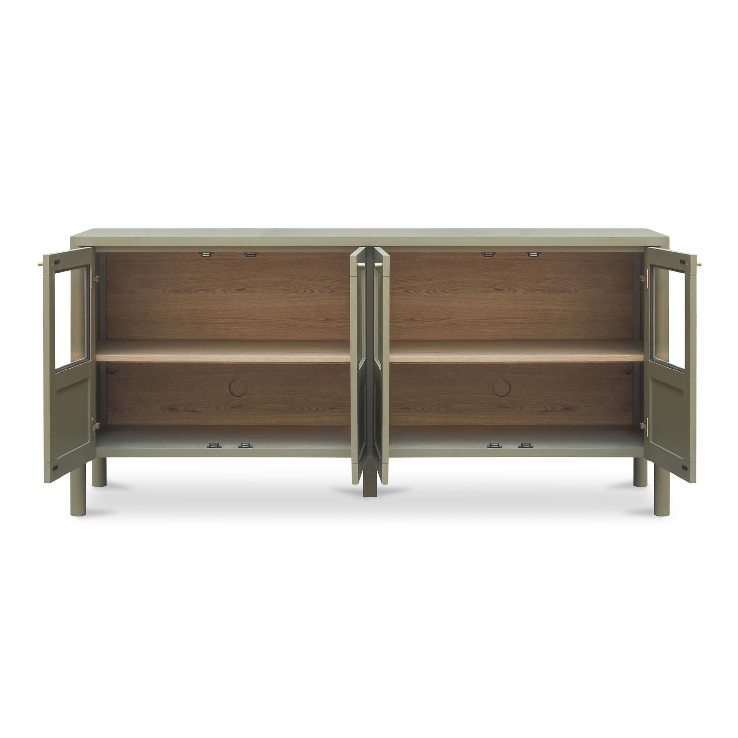 - Door front panels are a balance between transparent and concealed storage. Dowel legs and simple bronze hardware add softness