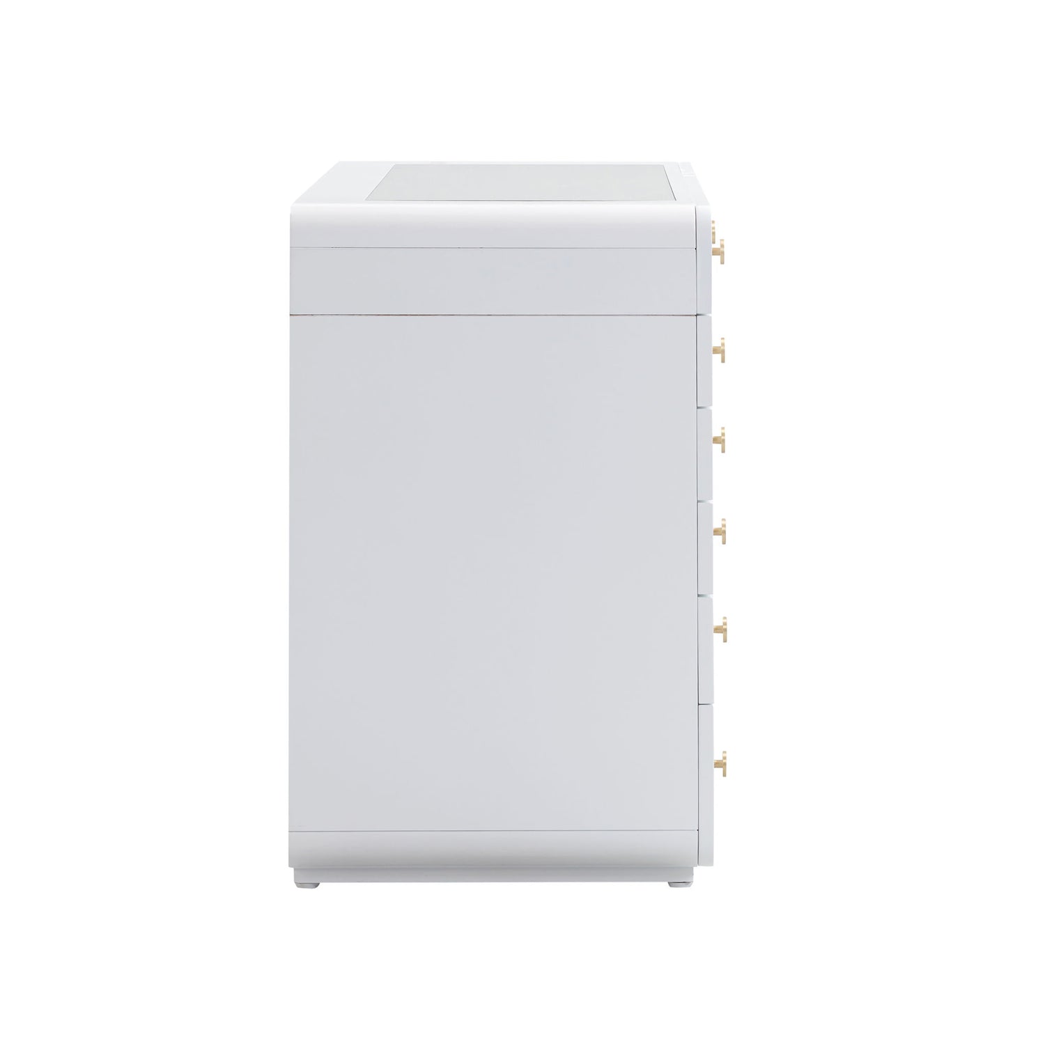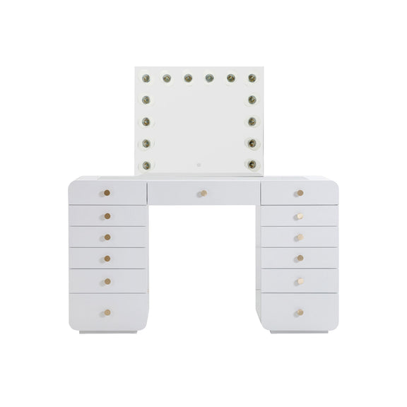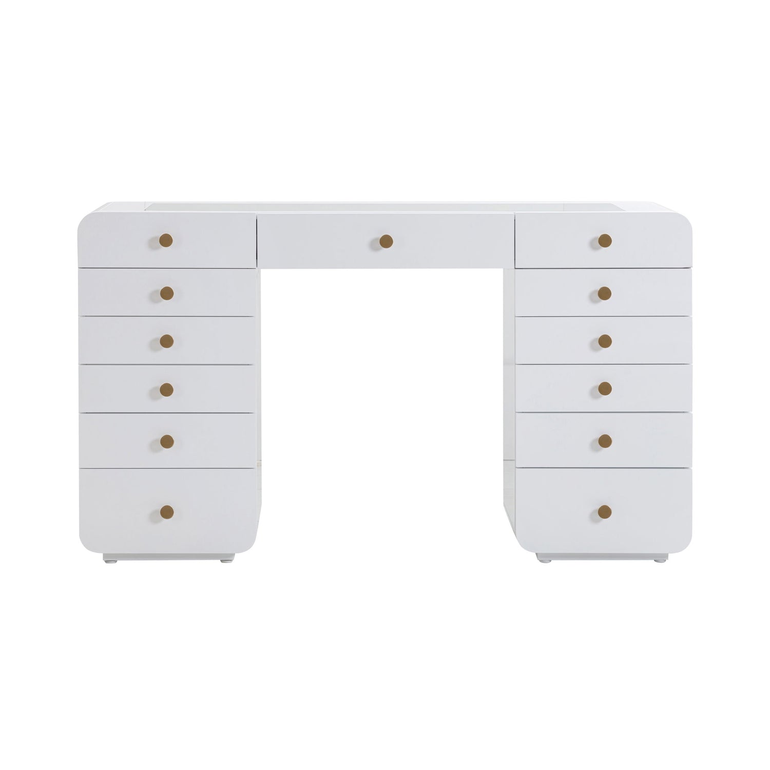 Introducing the Hollywood Vanity Desk: Your ultimate #GRWM station! Decked out with metal hardware and a top drawer lined for all your treasures, it's perfectly paired with the dazzling Lola vanity mirror for that extra sprinkle of Hollywood glam. This beauty boasts a spacious tabletop mirror to catch that good light, making your makeup pop and those selfies fire while ensuring cleanup is a breeze. With tons of drawers, including some shallow ones, it's all about keeping your products organized and easily accessible. For added versatility, the mirror can easily be disassembled or hung on the wall.