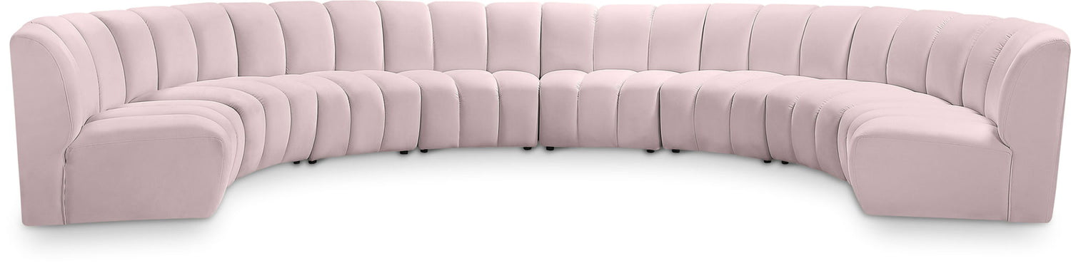 Create a seating group that works for every possible situation with this Infinity modular 8-piece sectional and other pieces in the Infinity collection. Upholstered in soft velvet material that feels great against the skin and offers long-wearing beauty, this piece fits with other Infinity items for an infinite number of combinations that get your seating requirements just right but that look just as nice when used on their own.