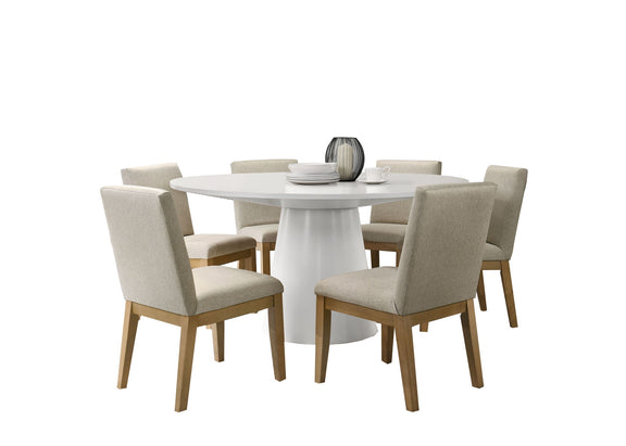 - Revamp your dining area with the distinctive 7-piece table and chair set from the Jasper collection. This set redefines modern elegance with its striking round pedestal table that stands as a statement piece in any room. The accompanying chairs, designed for both comfort and style, feature sleek lines and a contemporary flair that perfectly harmonizes with the table. Together, they create an inviting and sophisticated dining space, ideal for hosting dinners or enjoying everyday meals. Make your dining room the talk of the town with this exceptional blend of design and functionality.