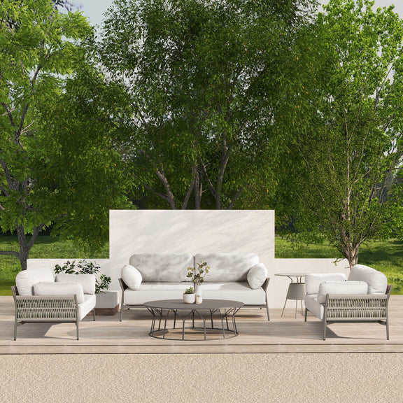 - Stylish Design: The Jasper Upholstered Patio Deep Seating Armchair features a trendy modern aluminum frame with woven Olefin rope detail, adding sophistication and style to any patio or deck setting.