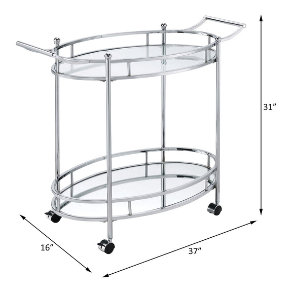 • Luxurious Touch: The gleaming chrome frame adds a luxurious touch, and the clear glass shelves let your displayed items take center stage, enhancing the cart's overall aesthetic appeal.